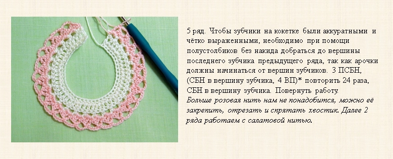 На много проще связать эту деталь платья отдельно и пришить нитками к изделию. Бретели вязать бордовыми нитками. Набираются петли в количестве десяти штук столбиками без накида, после этого продолжать тоже столбиками без накида, но вязать по два в один. Белая часть вяжется по той же схеме, что и бордовая, но провязать нужно четыре ряда, в каждом — два столб. без накида в предшествующий.