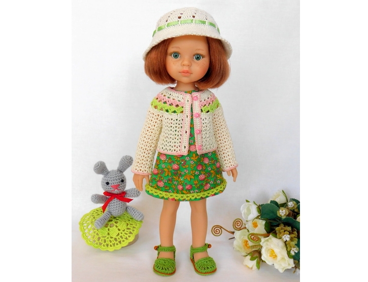 Если у вас есть кукла Паола Рейна, ее рост составляет 32 сантиметра, следуйте четко инструкции, так как она рассчитана именно на нее. Используйте пряжу Pelican Vita Cotton, Alize miss или Ирис, крючок 1,3. Оттенки пряжи: розовый, молочный, салатовый. При свободной вязки можно взять и более тонкий крючок — 1,1, при тугой — 1,5.