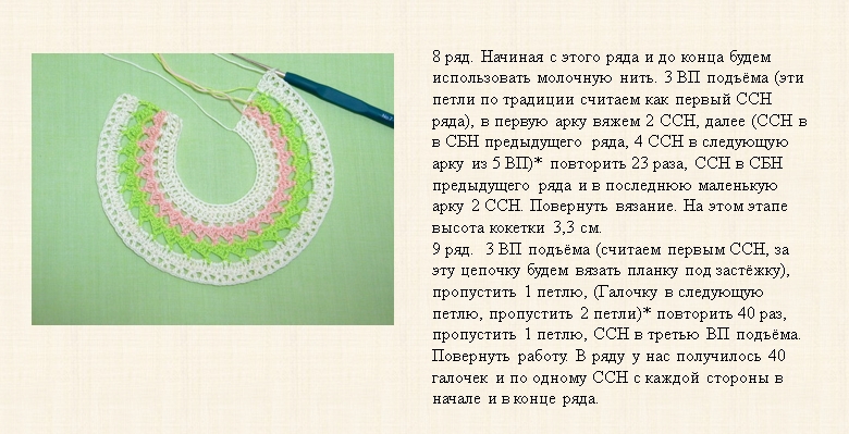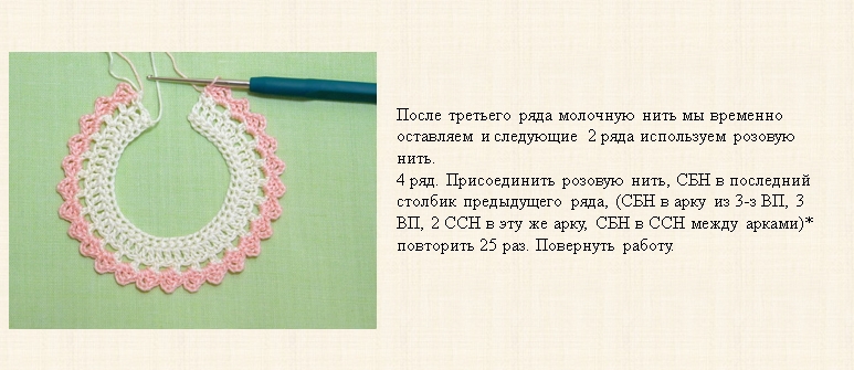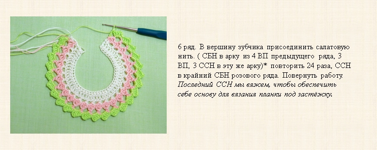 Набираются 28 возд. петель, они провязываются столбиками с накидом, затем, круг смыкается, продолжаем вязать столб. с накид. три круга. После этого — столбики без накида, для волнистого края — три столбика. В последнем ряду изделие провязывается столбиками без накида, чтобы получился плотный край корсета.