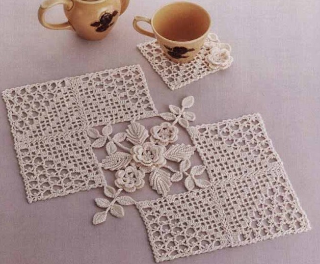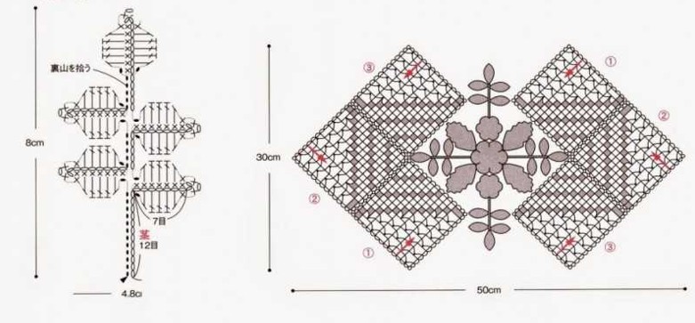 По схеме вяжутся и веточки — 4 штуки, с простыми листьями и 4 листа покрупнее. Все связанные элементы между собой сшиваются и прикрепляются к центральной части салфетки.