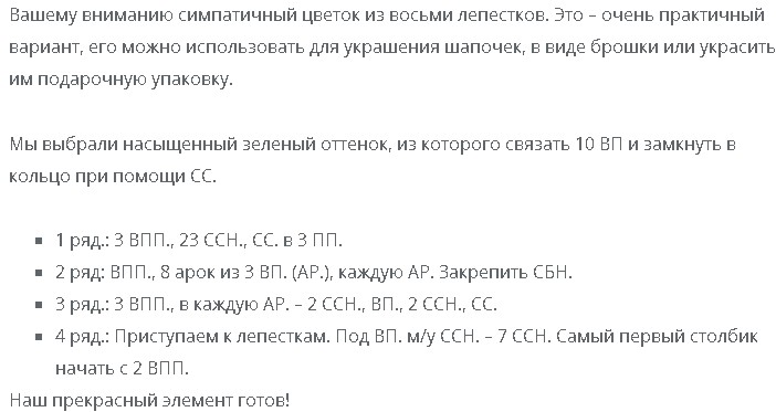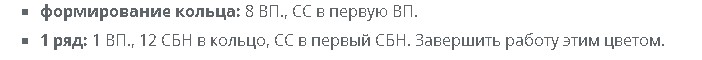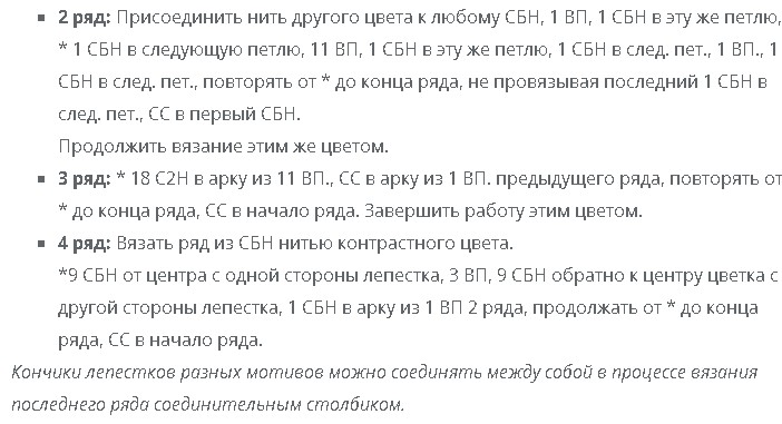 - Лепестки вяжутся в начале каждой дуги СБН, затем, один ССН, далее пять столбиков — с 2-мя накидами.