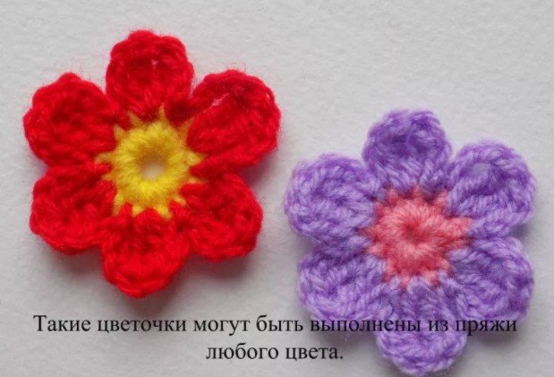 Третий шаг — вязание цветочков, для их изготовления потребуется пряжа любого цвета на выбор и крючок №4.