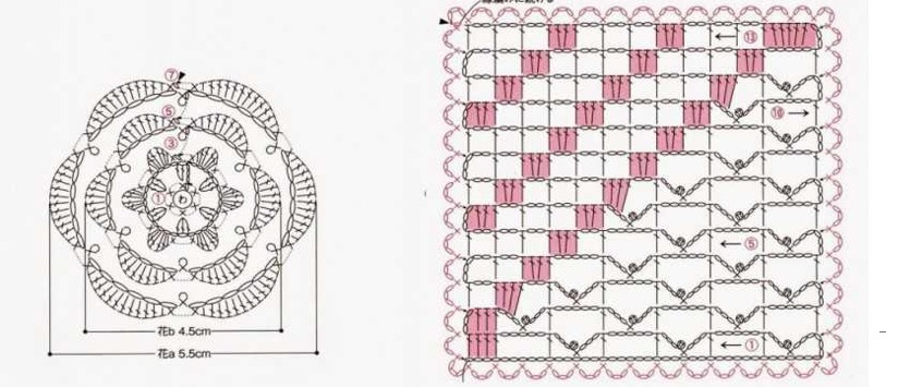 Сначала вяжутся квадраты по схеме, затем, в определенном порядке сшиваются. Украшением служат объемные цветы, два из которых имеют два ряда лепестков, а тот, который в середине — три.
