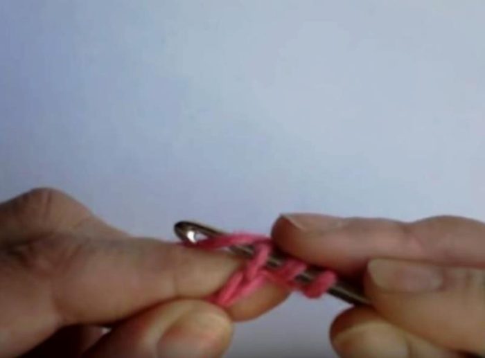 9. После этих шагов, у нас на самом крючке останется две петельки. Снова берем нитку, протягиваем ее через две петельки, которые остались на крючке. Получаем на крючке уже только одну петлю.