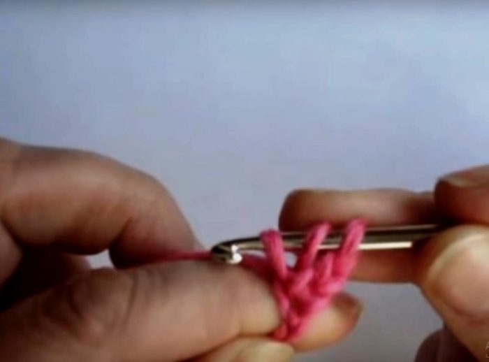 3. Крючок вводим в четвертую по счету от него петлю. Подхватываем нитку.