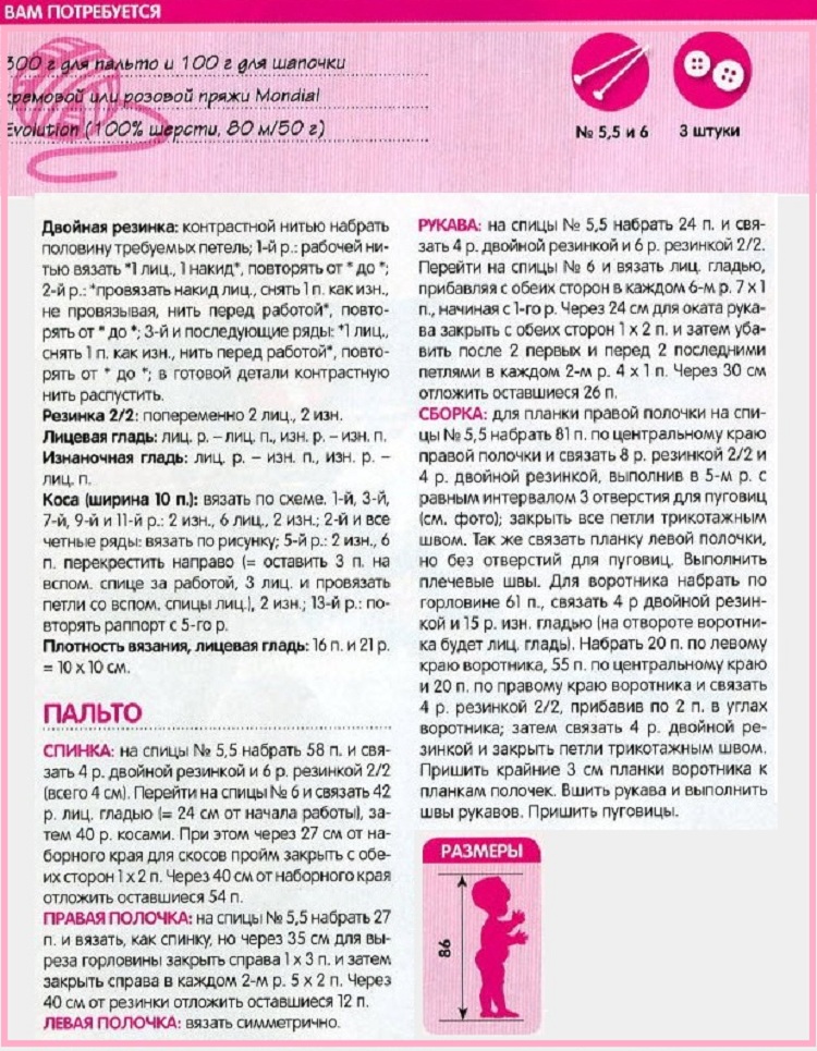 Для маленькой принцессы мамочки стараются связать самые красивые образы. Данное пальтишко укомплектовано шапочкой, которая завершает образ. Нитка средней плотности, спица № 5, можно № 4. Плотная вязка сделает изделие очень теплым, рыхлая придаст ажурности и воздушности.