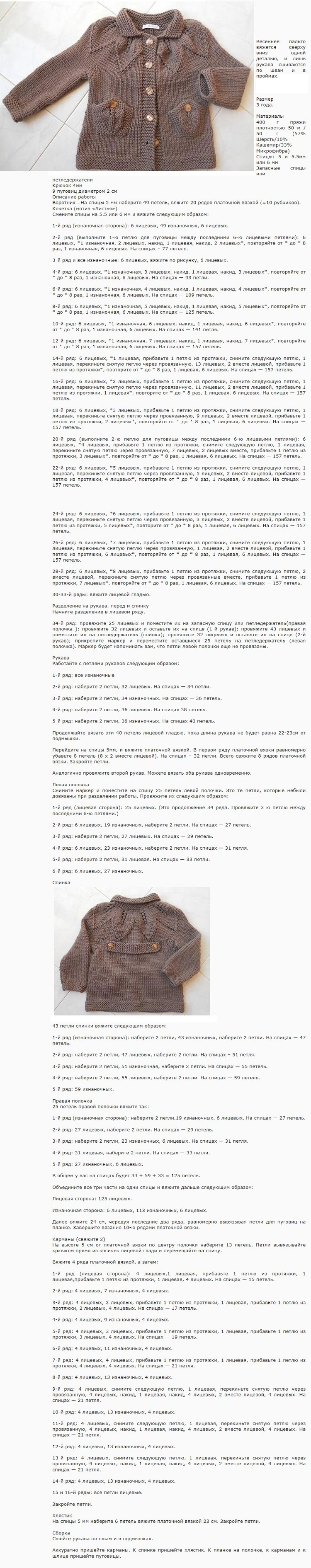 Весеннее пальтишко без подкладки на девочку 3-х лет. Накладные кармашки подчеркивают индивидуальность данной модели, ажурная кокетка придает ей изысканности. Модель вяжется одной деталью, начиная с кокетки и лишь к низу расширяется. Сшивается только рукавная часть.