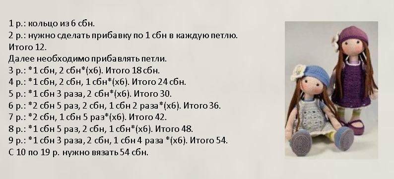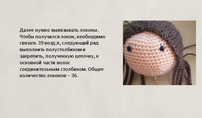 При изготовлении куклы, главное, вязать тело бежевой пряжей, цвет деталей одежды и волос — на ваше усмотрение. В перечне материалов мы представили расцветки ниток, которые использовались в данном варианте.