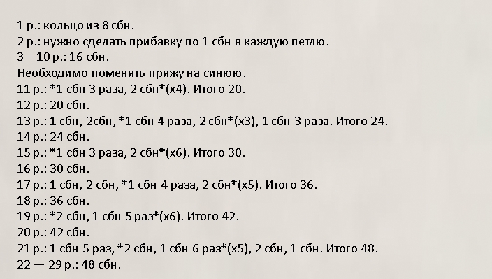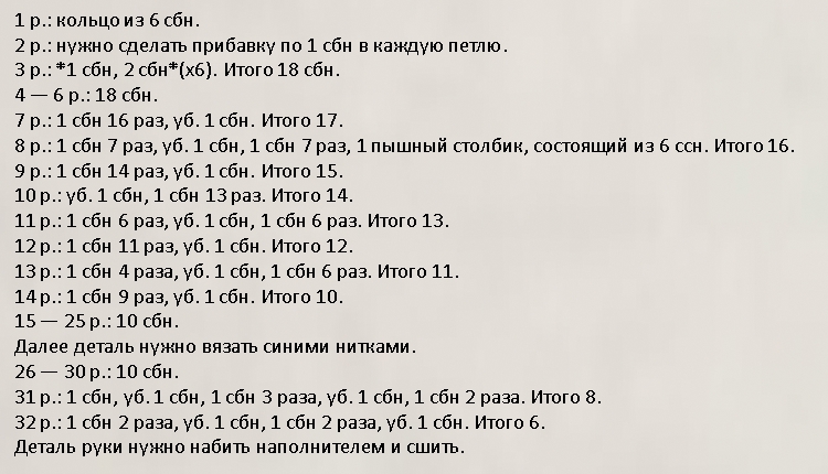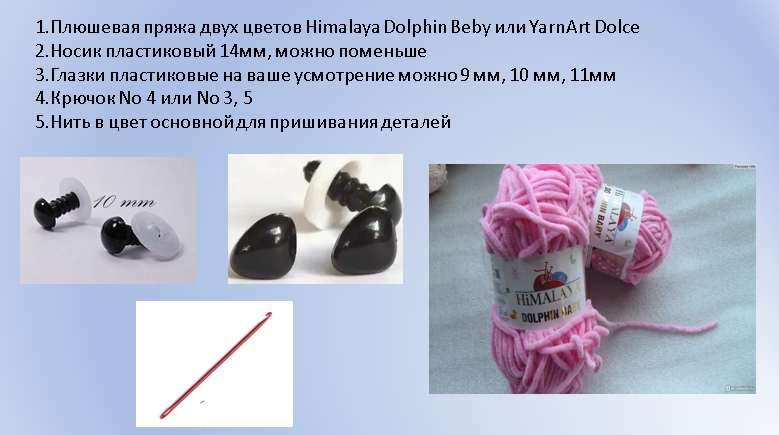 • пряжа для других деталей и волос: — бордовая, голубая, серая, серебряная, желтая, синяя.
