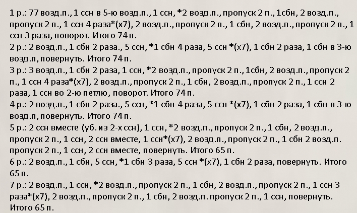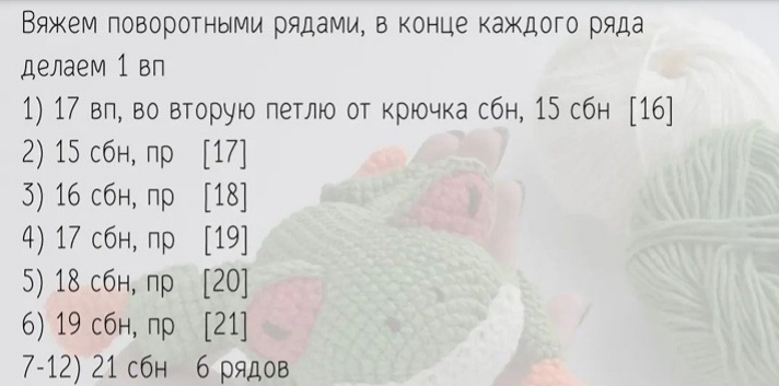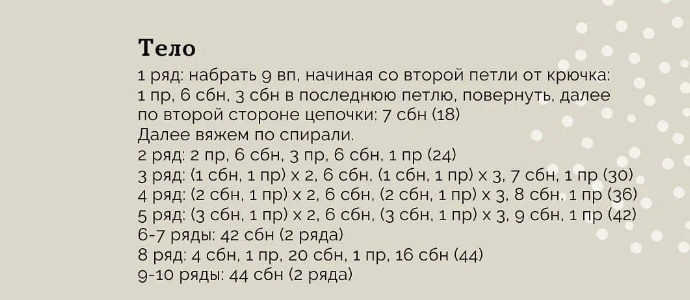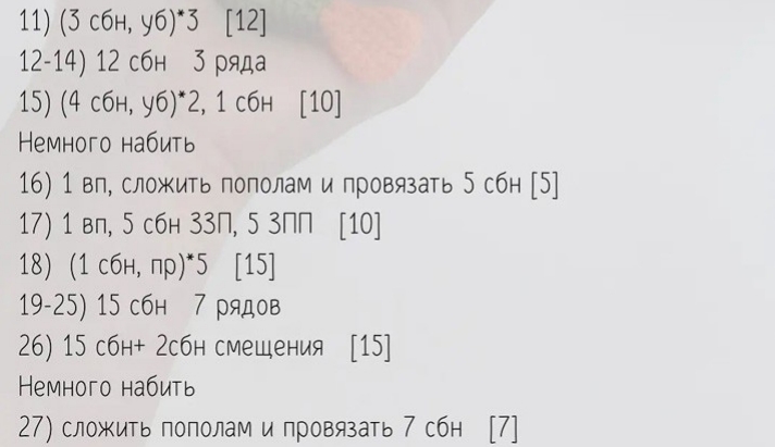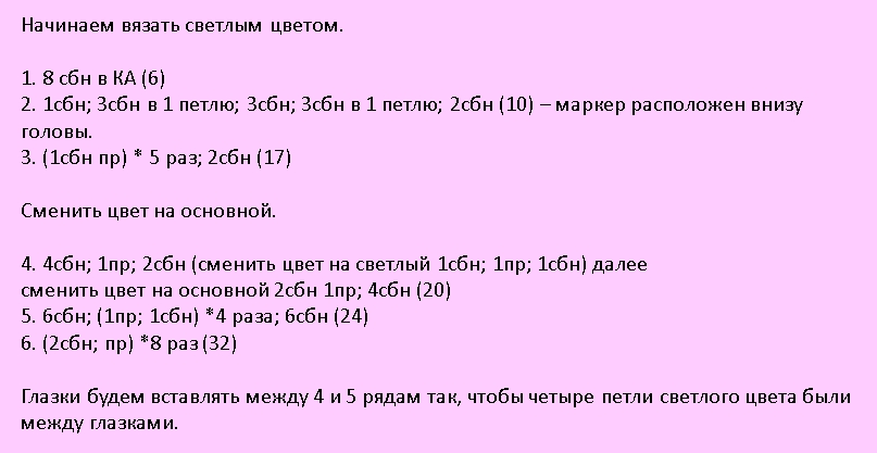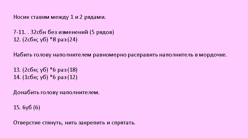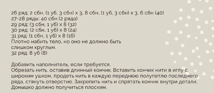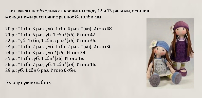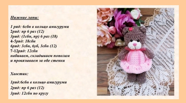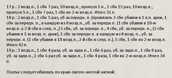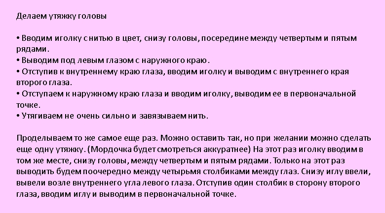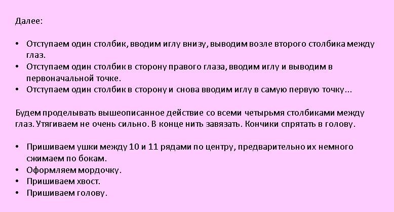 Чтобы одеть игрушку в платьице, начиная с 25 ряда нужно вязать петли «за заднюю стенку». Для юбочки в 1 ряду — в каждую петлю с накидом два столбика, во втором — столбик с накидом до конца ряда.