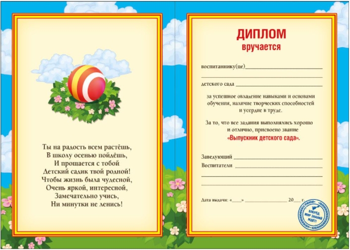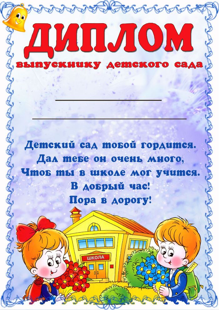 Каждому ребенку вручается именной диплом с напутствиями на дальнейшую интересную жизнь. Его шаблоны вы можете скачать на нашем сайте, как с готовым текстом, так и без него. Пустые бланки заполните по своему желанию, но обязательно укажите имена и фамилии детей. Для прочности рекомендуем наклеить бумажную распечатку на плотный картон.