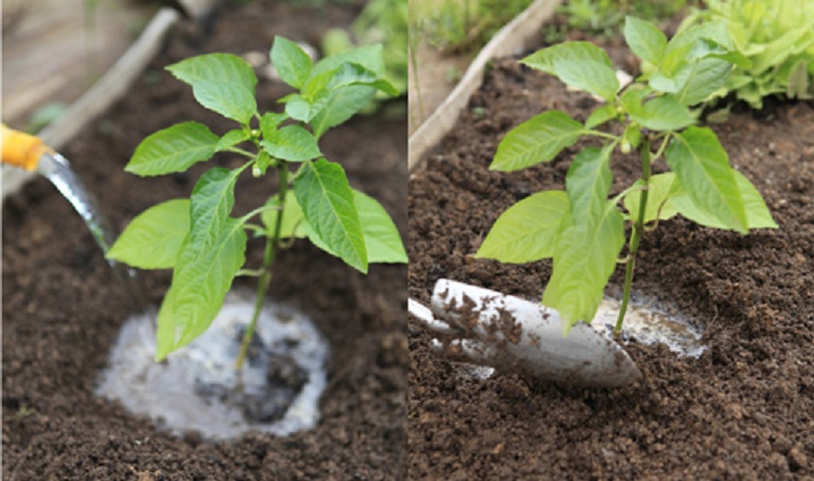 Высаживать нужно в не очень глубокие ямки, присыпать грунтом только корневую систему не более. Следом проводится полив, в среднем до 3-х литров на один куст. После того как грунт осядет, подсыпьте землю, корни должны быть спрятаны.