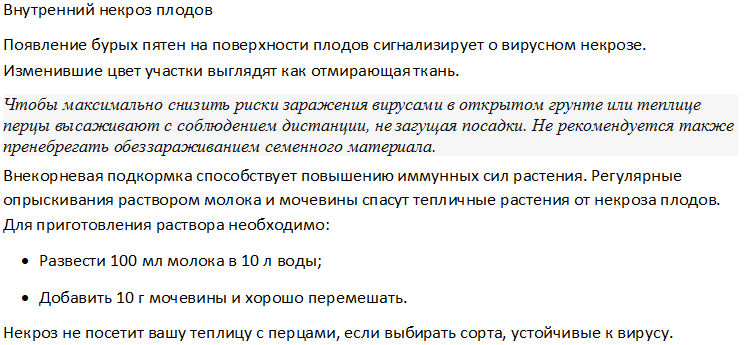 Для борьбы с вирусными заболеваниями используют метод опрыскивания всех тепличных растений. В результате чего снижается риск зараженности всех высаженных перцев. Инфицированные кусты выкапываются без сожаления. Лунки после выкопанных кустов сразу же обеззараживаются химическими средствами.