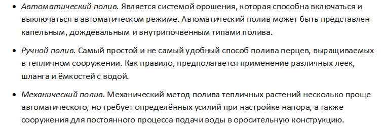Поливаются тепличные перцы в идеале утречком до появления первых солнечных лучей. Если же нет возможности провести утреннее поливание, подойдет вечернее время после захода солнца.