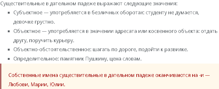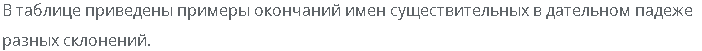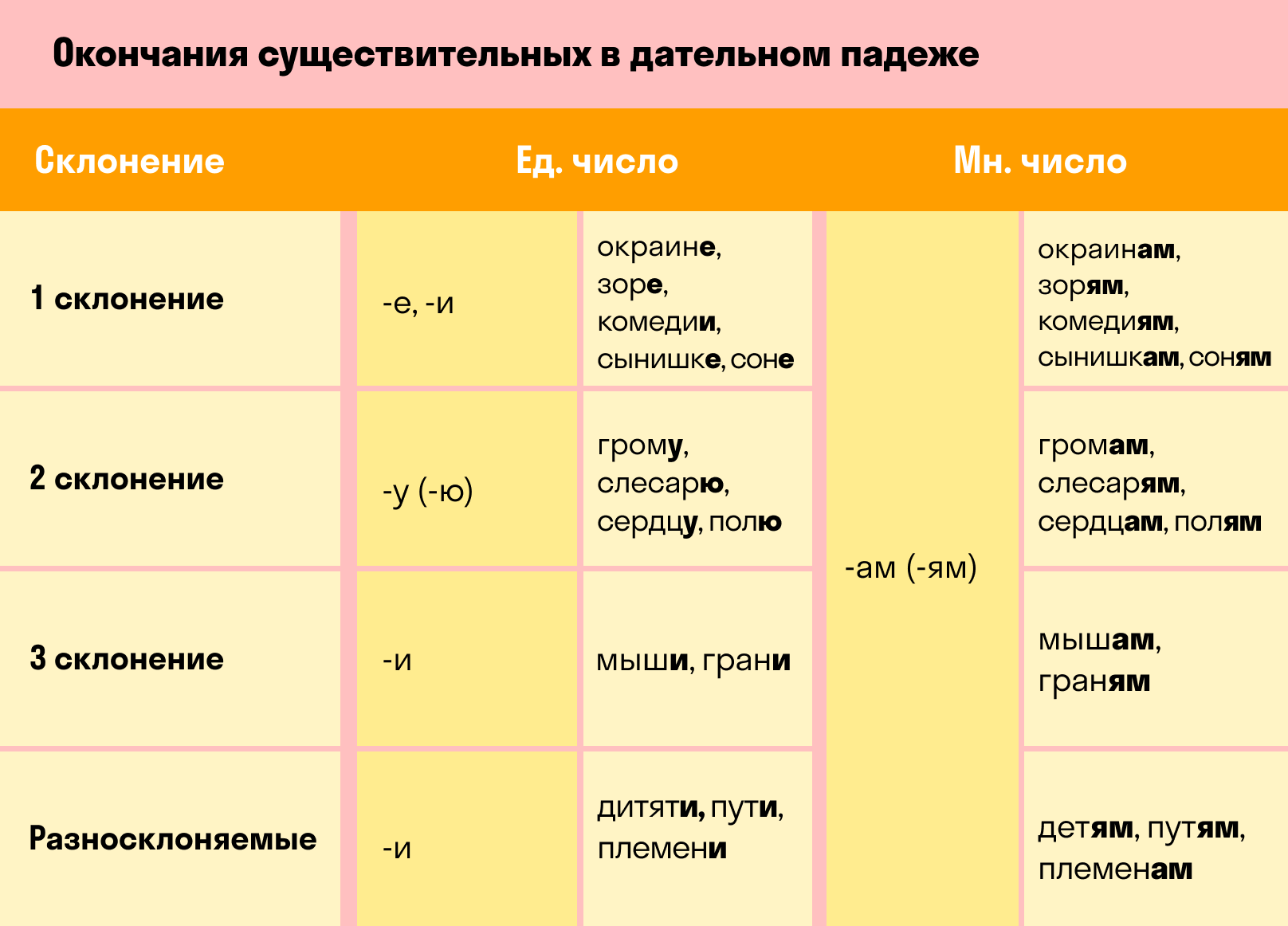 таблица окончание существительных в дательном падеже, единственное и множественное число