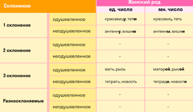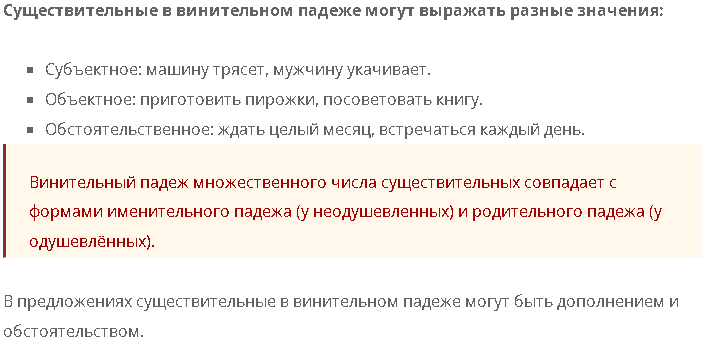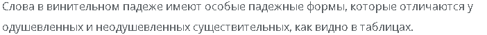 таблица окончание существительных в винительном падеже: единственное и множественное число