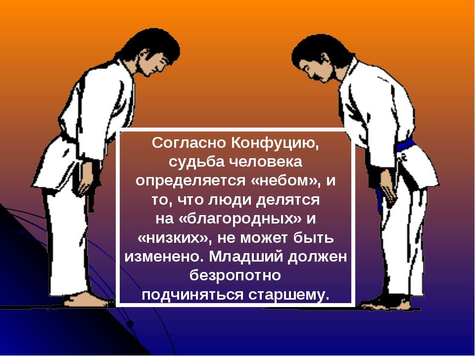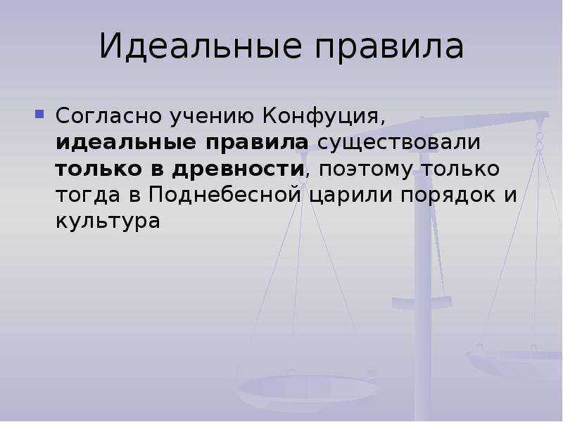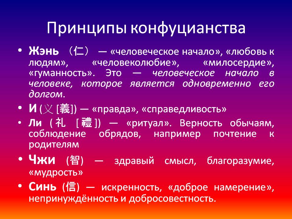 Справедливость в жизни и нравственность — основные принципы Конфуция. В обществе, которое высоконравственное, соблюдаются правила поведения, уважение к окружающим, помощь тем, кто нуждается, потребность в знаниях.