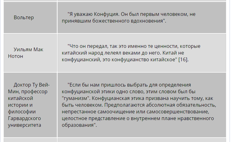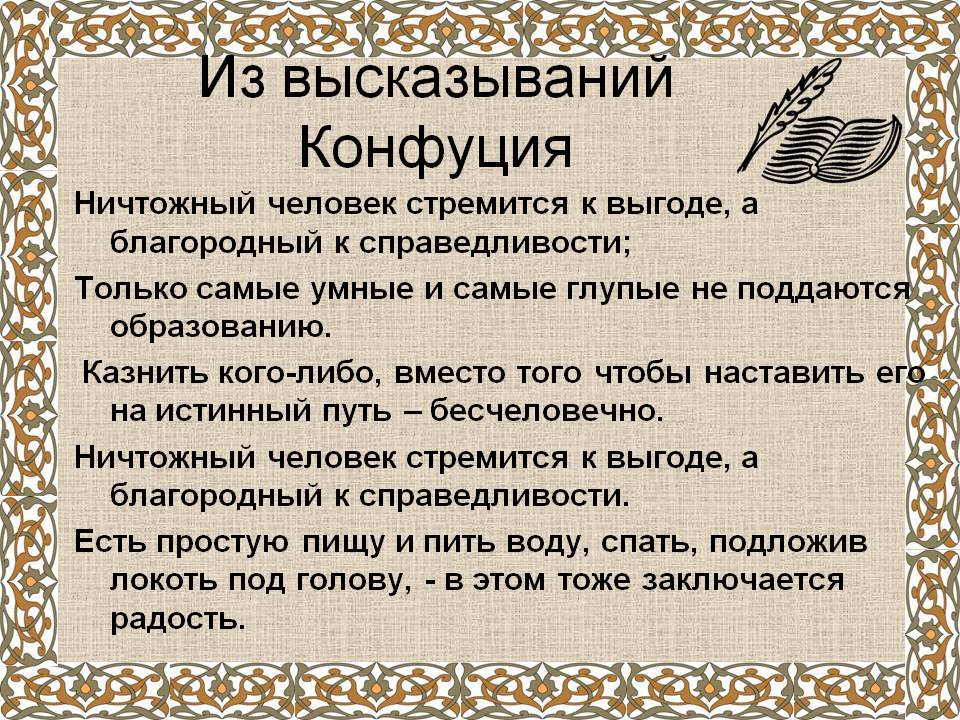 Большой философский смысл с одной стороны и простота высказывания, с другой, характеризует Золотое правило Конфуция. Оно заключается в том, что человек не должен делать другому того, чего не хочет себе. И аналогичное — к людям относись так, как хотел бы, чтобы относились к тебе. Такой же смысл положен в основу многих религий мира.