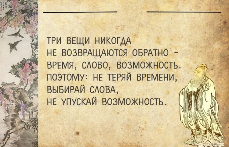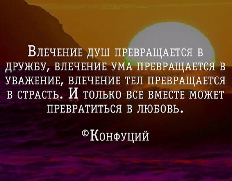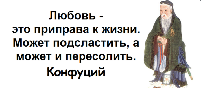 Ключевое значение имеют высказывания Конфуция о любви. Любовь — это начало начал, без любви нет жизни. Представьте, если материальная сторона ваших желаний исполнилась. У вас есть большой дом, хорошая машина, счет в банке. Но взамен на материальные блага, у вас отняли любовь. Вы выполняете все действия, не испытывая любви к жене, детям, родителям, друзьям, работе и живете как робот. В вашем доме воцарилось молчание, вы дарите подарки и общаетесь с друзьями, только потому, что выгодно. Друзья с вами общаются тоже из-за выгоды. Вряд ли кто-то захочет так жить. Отсюда вывод, чтобы обрести счастье и спокойствие души, излучайте любовь, дарите ее, тогда мир вокруг вас, будет преображаться и жизнь ваша и ваших близких изменится.