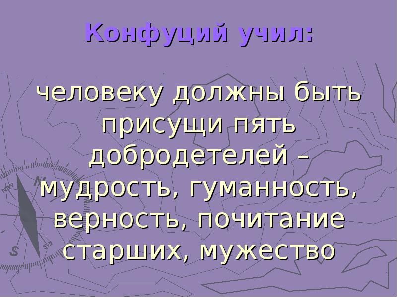 Он предлагал следовать пяти добродетелям, которые, он сравнивал с деревом:
