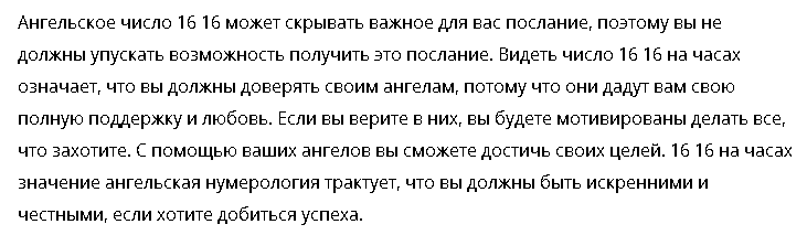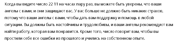 Данное сочетание числовых знаков на часах означает удачу. Если вы случайно посмотрели на часы и увидели такое время, это означает, что ангелы способствуют тому, чтобы вы приняли правильное решение. Настало время проявить свои способности, ставить цели и идти к ним. Кроме этого, за вами присматривает Создатель и оберегает вас.