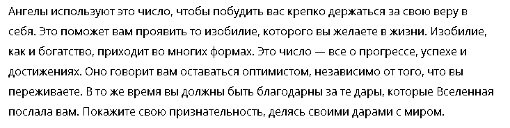 С помощью этих цифр ангелы подсказывают, что предстоит сделать правильный выбор, они находятся рядом и помогут это сделать.Кроме этого, они будут способствовать преодолению трудностей, помогут избавится от негатива, открыть новые аспекты вашей личности.