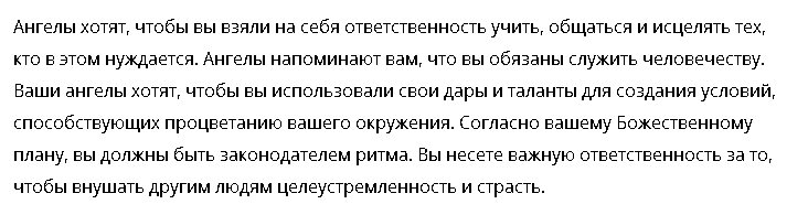 Ангелы проявляют о вас заботу, оказывают поддержку, поощряют на принятие правильных решений. Вам предстоит хорошо все продумать, использовать все возможности. Не следует спешить, чтобы не ошибиться и не принять неправильное решение. Если вы в данный момент находитесь в трудной ситуации, ангелы помогут ее преодолеть.
